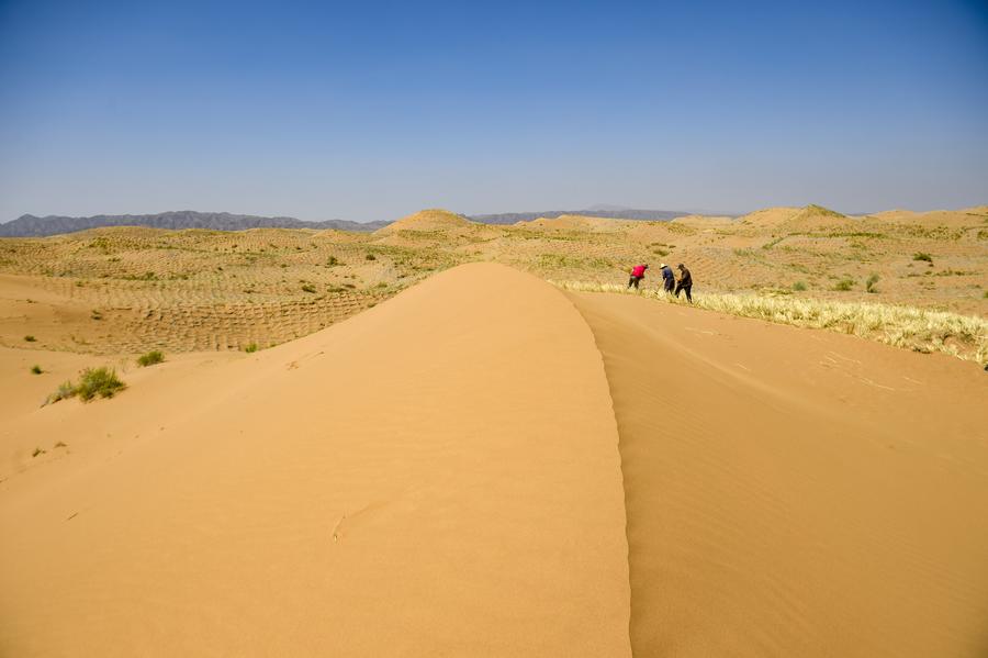 ZHONGWEI, June 17 (Xinhua) -- In the 1950s, to protect China's first railway that runs through a desert, the city of Zhongwei embarked on a journey of desert mitigation. Scientists at the Shapotou Desert Research and Experiment Station, part of the Northwest Institute of Eco-Environment and Resources of the Chinese Academy of Sciences, along with local residents, developed straw checkerboards to stabilize the sand and prevent dunes from shifting.