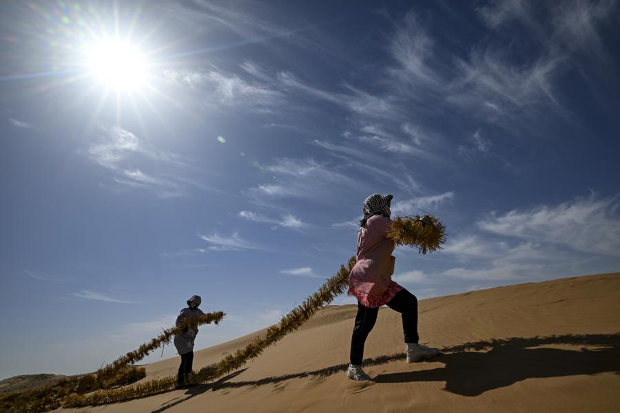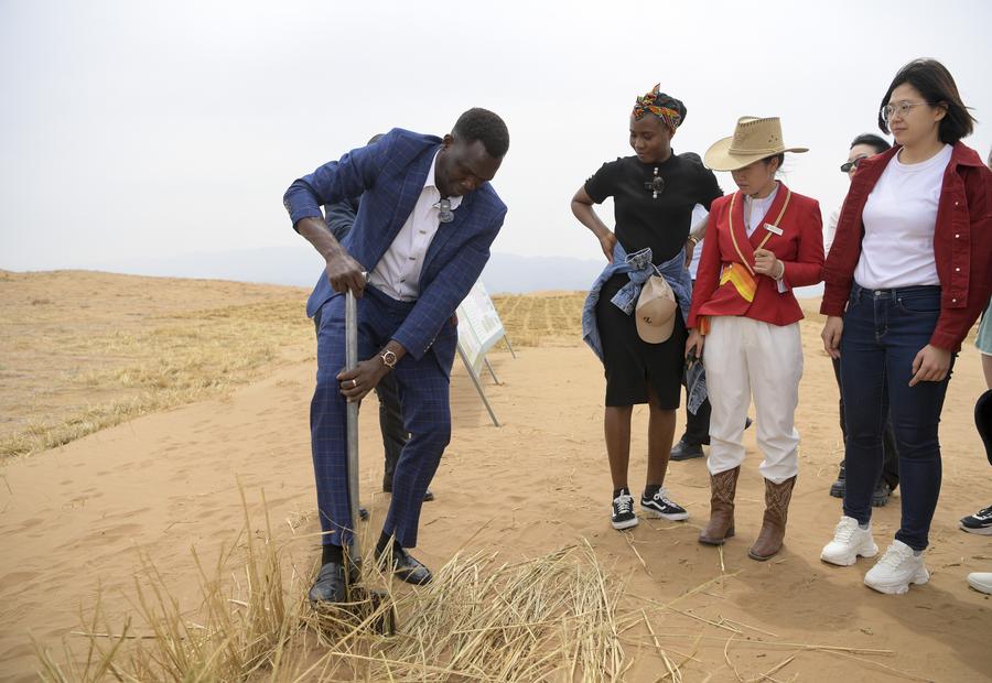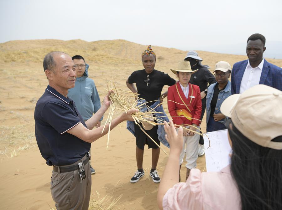 A worker paves straw checkerboards in the Tengger Desert, in Zhongwei of northwest China's Ningxia Hui Autonomous Region, May 30, 2024. (Xinhua/Feng Kaihua)A Kenyan Ph.D. candidate (1st L) of Peking University tries to set up a part of the straw checkerboard in the Tengger Desert, northwest China's Ningxia Hui Autonomous Region, May 31, 2024. (Xinhua/Feng Kaihua)Tang Ximing (1st L), a senior engineer at a state-owned forestry farm in Zhongwei, introduces the using of straw checkerboards to international youths in northwest China's Ningxia Hui Autonomous Region, May 31, 2024. (Xinhua/Feng Kaihua)An aerial drone photo taken on May 30, 2024 shows workers paving straw checkerboards in the Tengger Desert, in Zhongwei of northwest China's Ningxia Hui Autonomous Region. (Xinhua/Feng Kaihua)