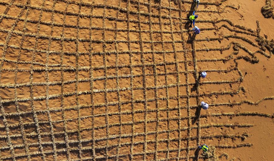 An aerial drone photo taken on May 30, 2024 shows workers paving straw checkerboards in the Tengger Desert, in Zhongwei of northwest China's Ningxia Hui Autonomous Region. (Xinhua/Feng Kaihua)