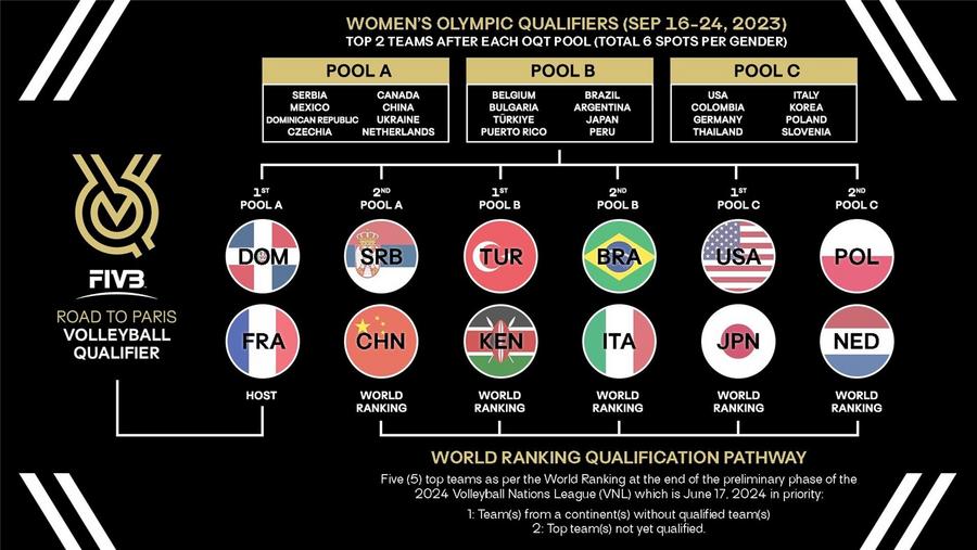 Defending champions the United States, three-time Olympic champions China, reigning world champions Serbia, and current VNL (Volleyball Nations League) champions Türkiye are all included in the 12 teams for Paris 2024.