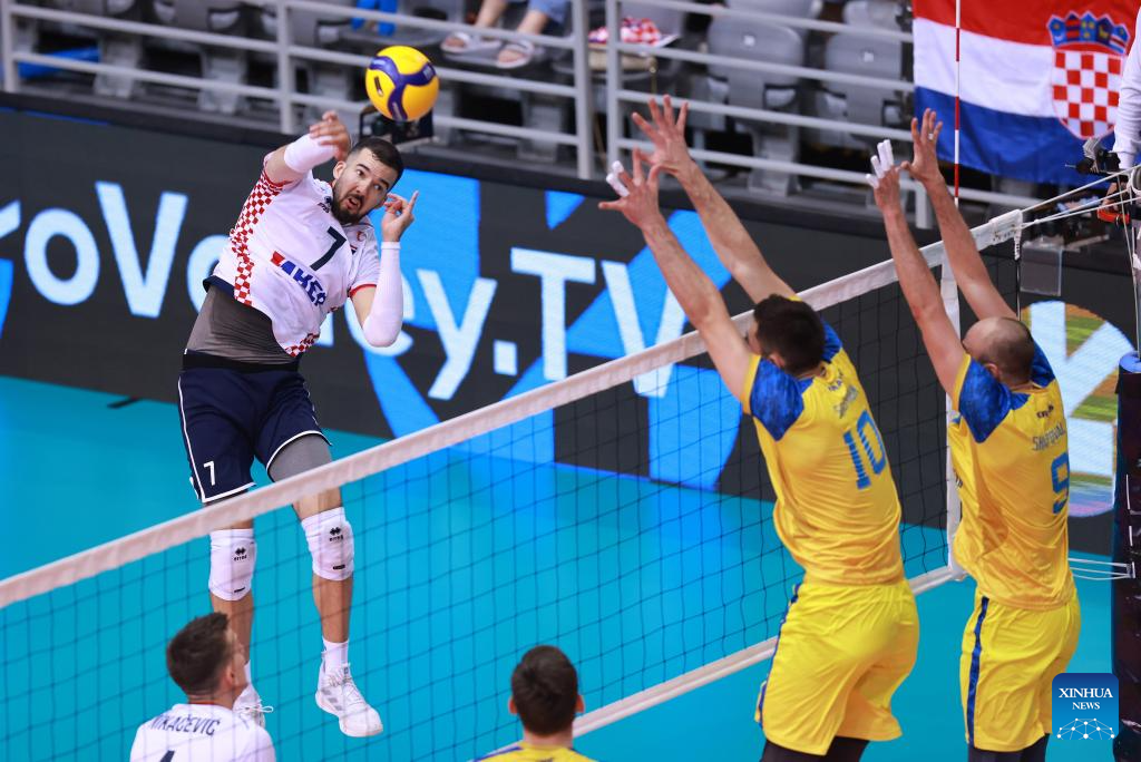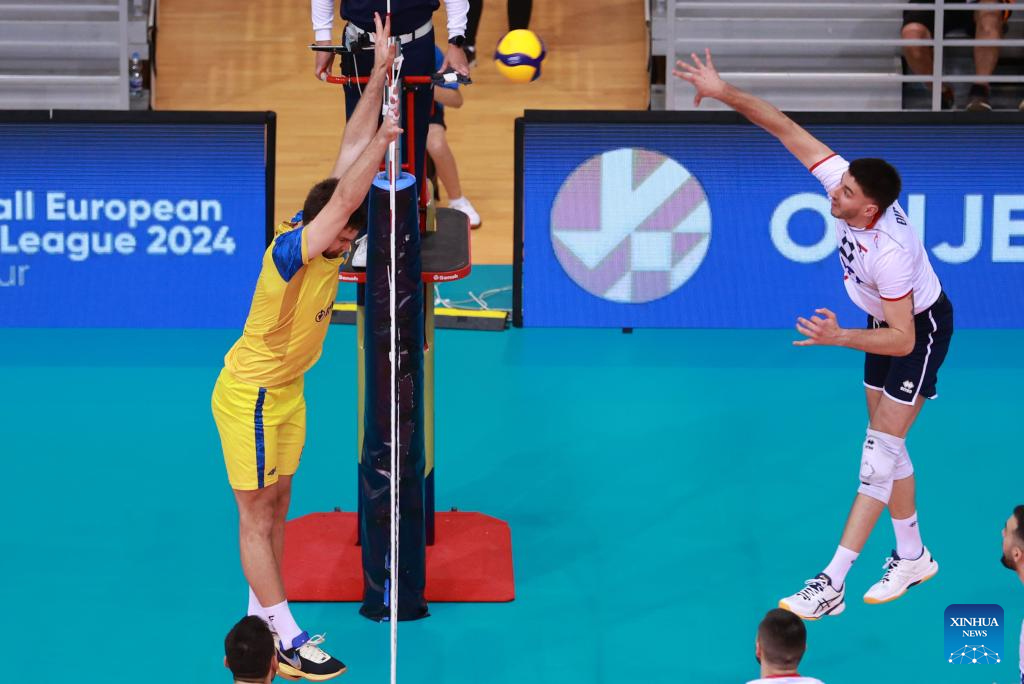 Yurii Semeniuk (L) of Ukraine spikes the ball during the Men's final match between Croatia and Ukraine at CEV Volleyball European Golden League 2024 in Osijek, Croatia, on June 16, 2024. (Photo by Davor Javorovic/PIXSELL via Xinhua)