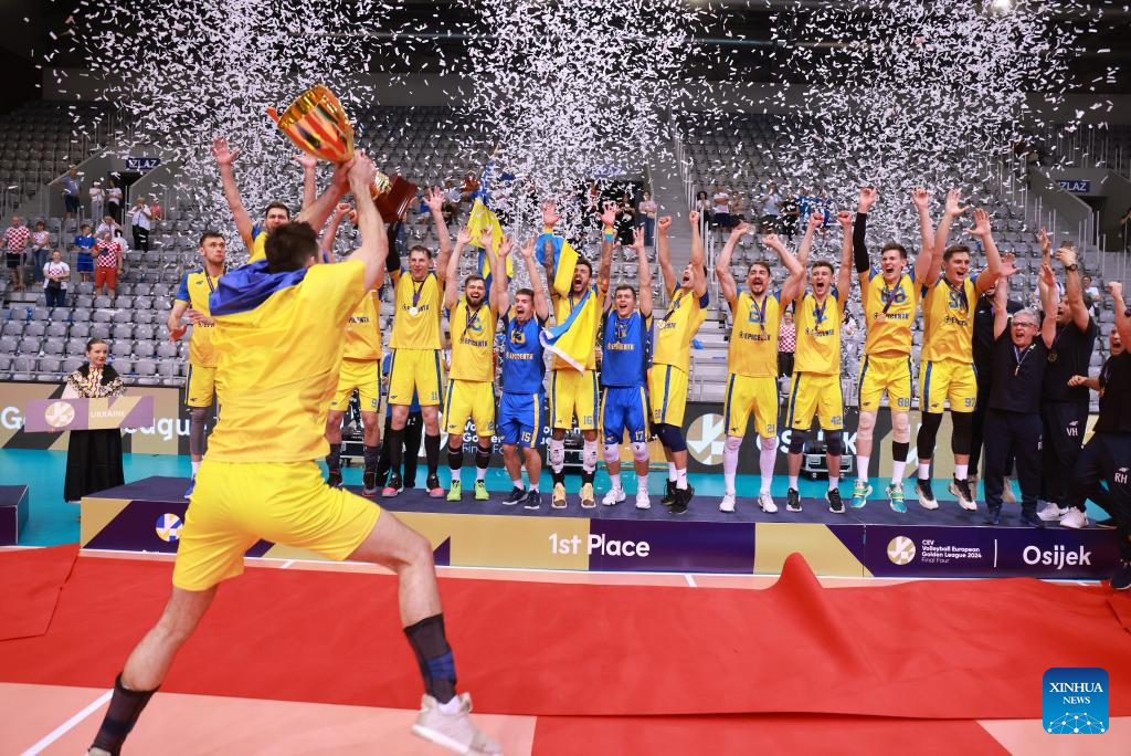 Players of Ukraine celebrate victory during the gold medal ceremony after the Men's final match between Croatia and Ukraine at CEV Volleyball European Golden League 2024 in Osijek, Croatia, on June 16, 2024. (Photo by Davor Javorovic/PIXSELL via Xinhua)