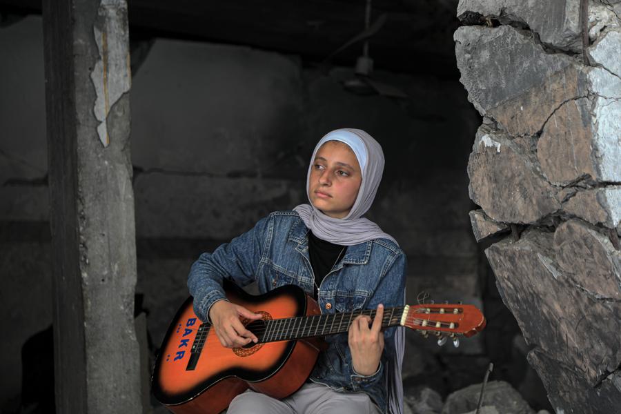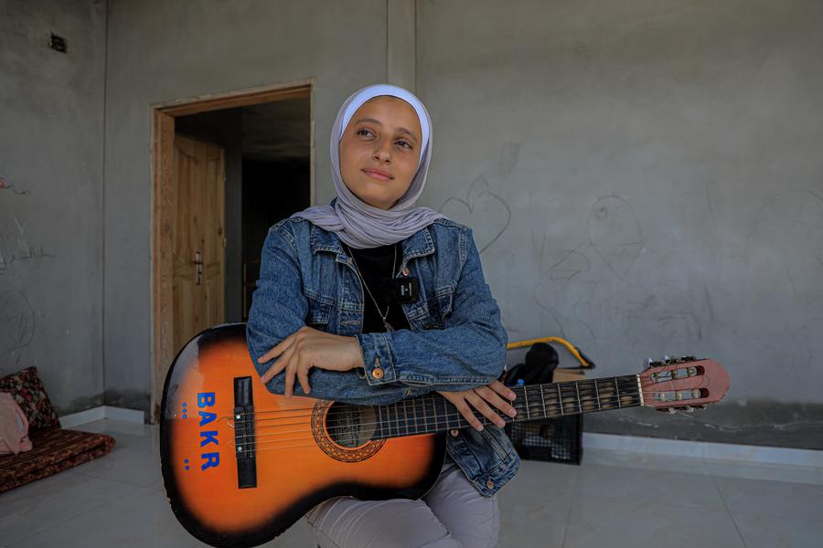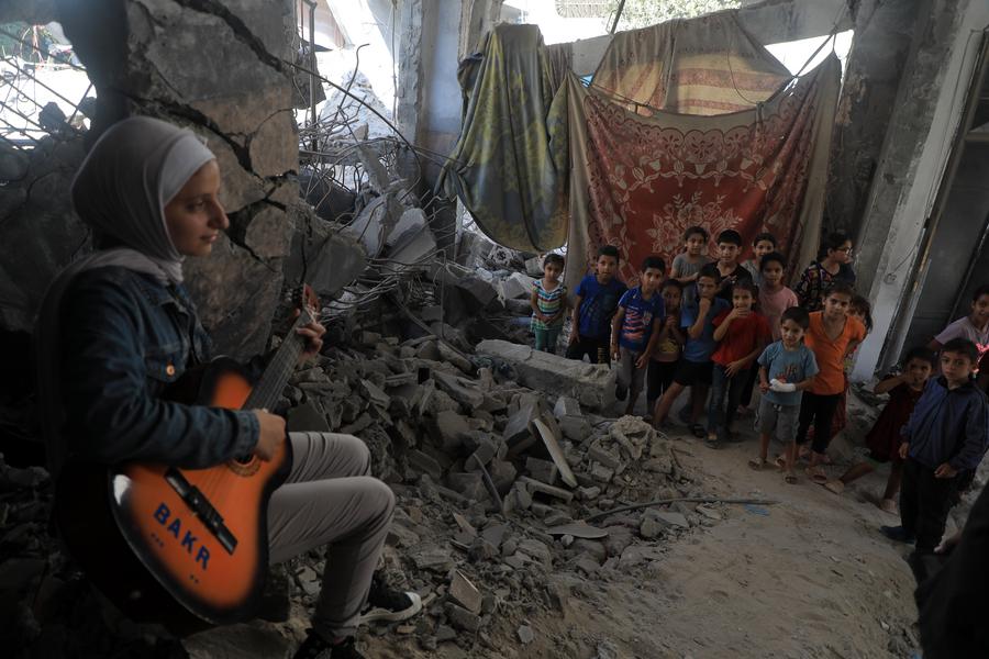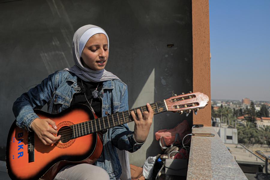 GAZA, June 17 (Xinhua) -- Rahaf Naser, a 19-year-old Palestinian student, moves from one place to another every day to play the guitar and sing songs in central Gaza Strip's Deir al-Balah city to soothe her fellow townsfolk who have been haunted by persistent Israeli assaults.
