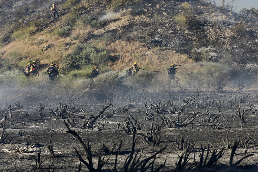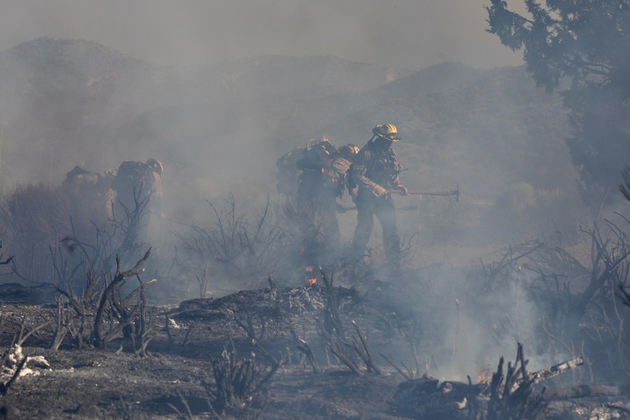 Firefighters operate at a site of the Post Fire in Gorman, about 100 km north of Los Angeles, California, the United States on June 16, 2024. (Xinhua)