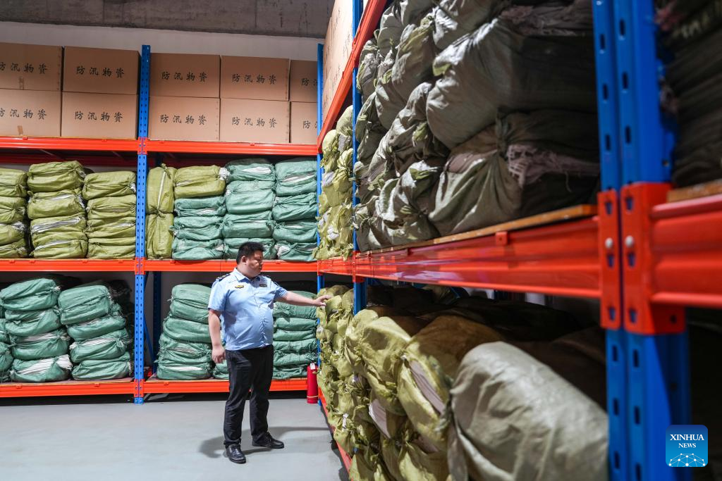 A worker checks flood control materials at a warehouse in Changsha, central China's Hunan Province, June 18, 2024. China's meteorological authority on Tuesday issued a yellow alert for rainstorms in some areas of the country.