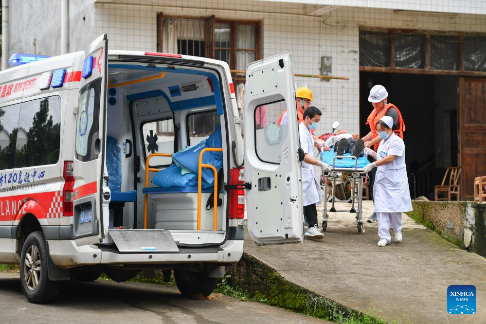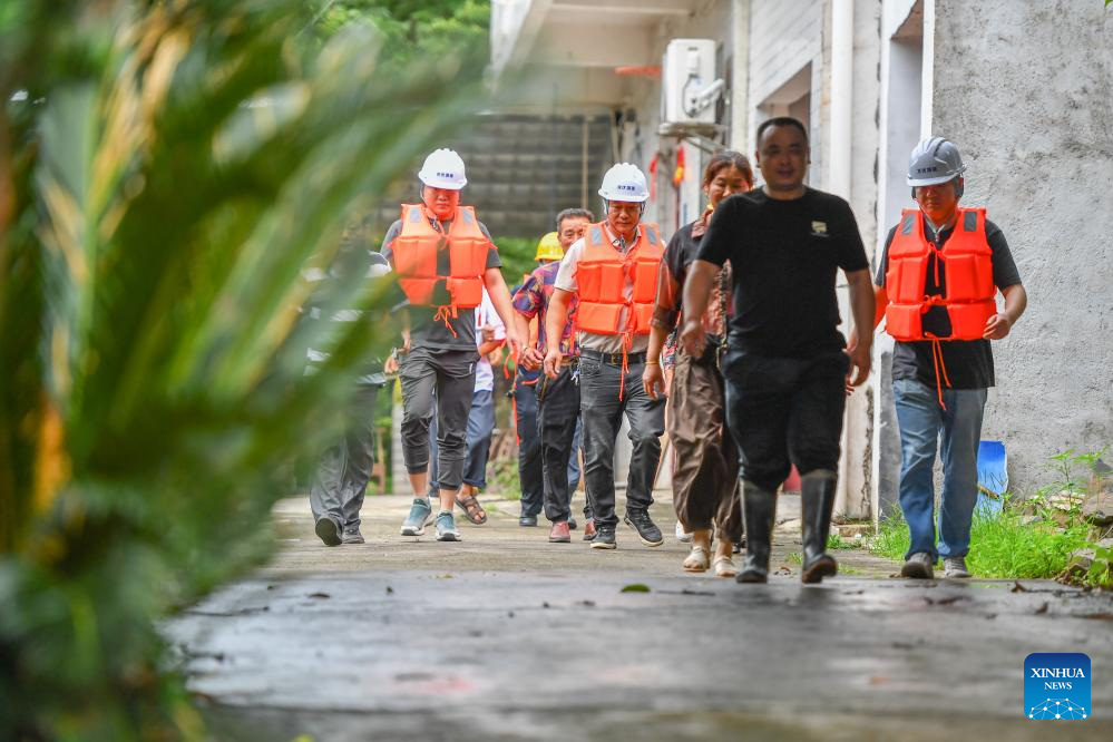Workers conduct an emergency response drill in Longfu Village in Liuyang, central China's Hunan Province, June 18, 2024. China's meteorological authority on Tuesday issued a yellow alert for rainstorms in some areas of the country.