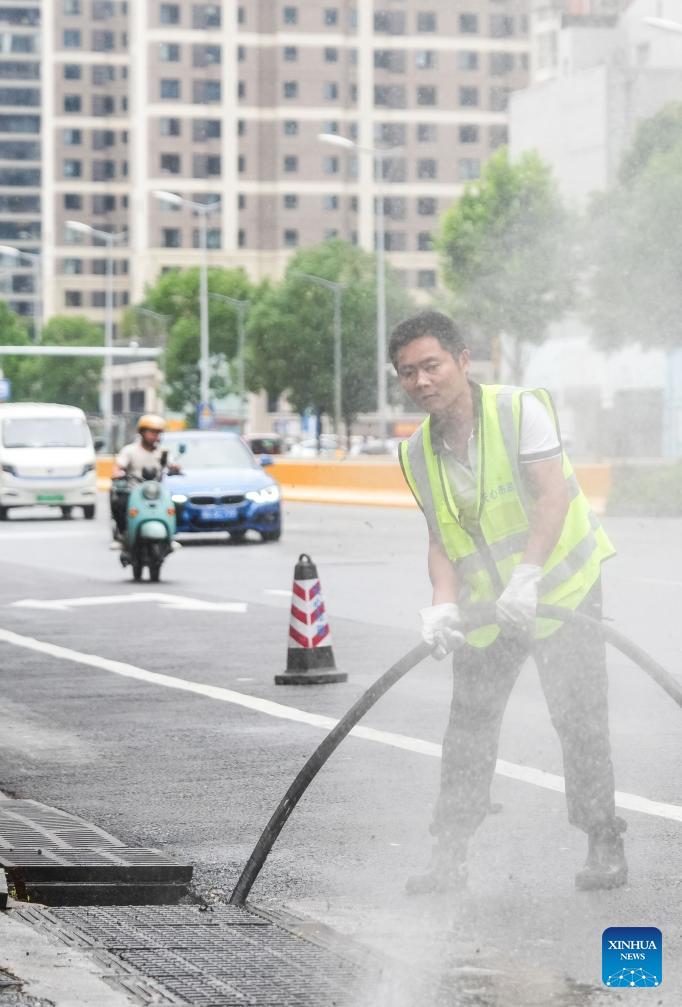 A worker cleans drains on a street in Changsha, central China's Hunan Province, June 18, 2024. China's meteorological authority on Tuesday issued a yellow alert for rainstorms in some areas of the country.