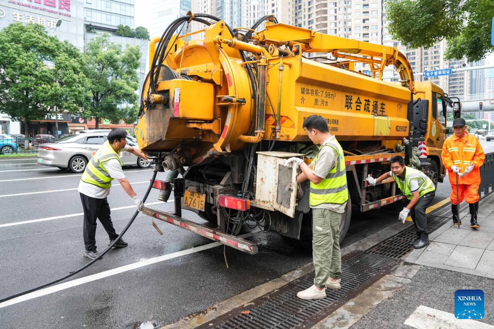 Workers clean drains on a street in Changsha, central China's Hunan Province, June 18, 2024. China's meteorological authority on Tuesday issued a yellow alert for rainstorms in some areas of the country.