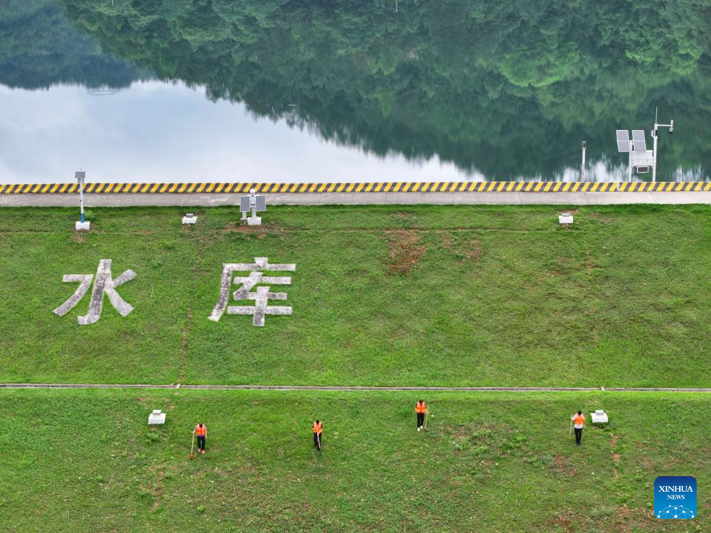 An aerial drone photo taken on June 18, 2024 shows workers patrolling at a reservoir in Liuyang City, central China's Hunan Province. China's meteorological authority on Tuesday issued a yellow alert for rainstorms in some areas of the country.
