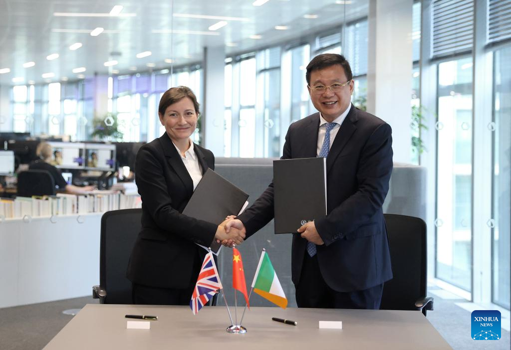 President of Xinhua News Agency Fu Hua and Emily Shelley, chief executive officer of Britain's PA Media Group, sign a memorandum of understanding (MoU) on deepening bilateral cooperation during a meeting in London, Britain, June 17, 2024. (Xinhua/Li Ying)
