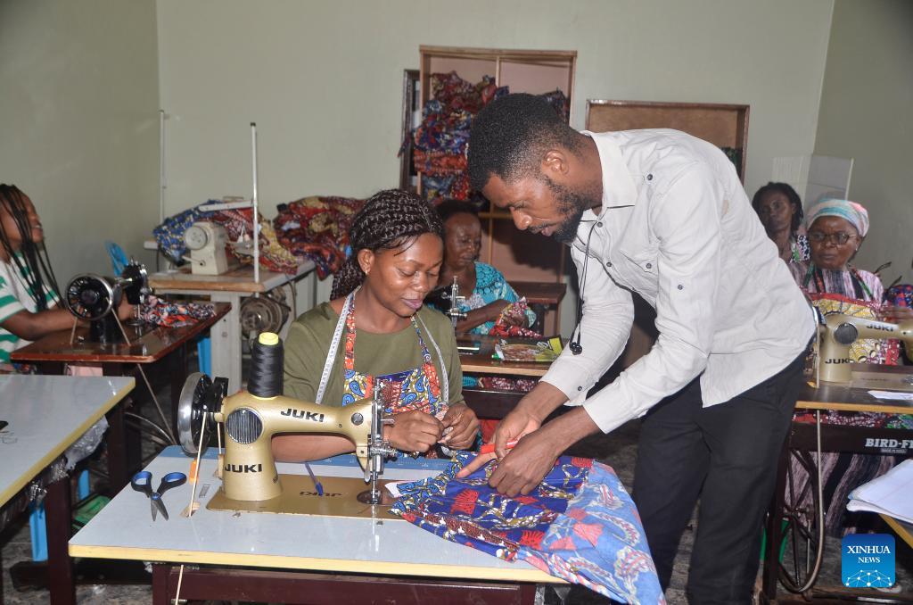 A staff member (R) of People for Peace and Defense of Rights (PPRD), a refugee-led non-governmental organization, helps a refugee learn tailoring skill during a tailoring and fashion training class in Kampala, Uganda, June 11, 2024. (Photo by Nicholas Kajoba/Xinhua)