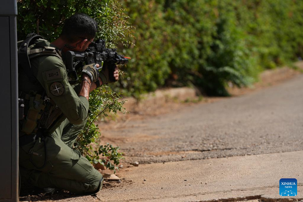 An Israeli reserve soldier takes part in a military drill in Kiryat Shmona, northern Israel, on June 18, 2024. The Israeli military announced Tuesday that it has approved "operational plans" for an offensive against the Lebanese armed group Hezbollah. (Ayal Margolin/JINI via Xinhua)