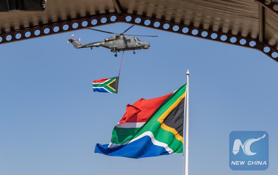 A helicopter flies over the swearing-in ceremony of South African President Cyril Ramaphosa in Pretoria, South Africa, June 19, 2024. (Xinhua/Zhang Yudong)