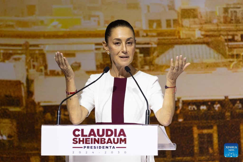 Mexican president-elect Claudia Sheinbaum speaks during a meeting of the coalition led by the governing National Regeneration Movement (Morena) in Mexico City, capital of Mexico, June 18, 2024. (Xinhua/Li Mengxin)