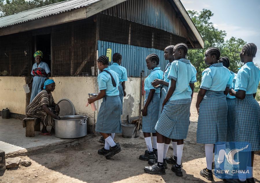 Students line up for food at Lifeworks Tumaini Girls Secondary School at Kakuma refugee camp in Turkana, Kenya, June 18, 2024. (Xinhua/Wang Guansen)