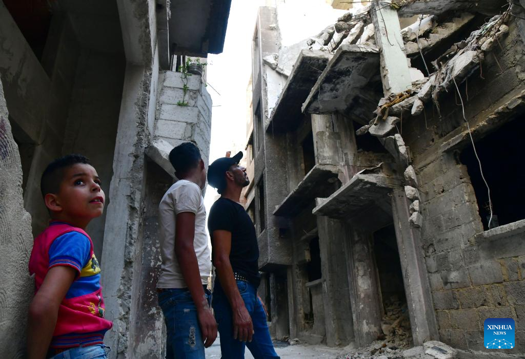 Mohammed Al-Aqad and his children look at their war-damaged apartment at the Yarmouk camp in Damascus, Syria, June 19, 2024. Al-Aqad was born into a legacy of displacement. His family originally hailed from Khan Younis in Gaza, but like many Palestinians in 1948, they were forced to leave their homeland and sought refuge in Syria.
