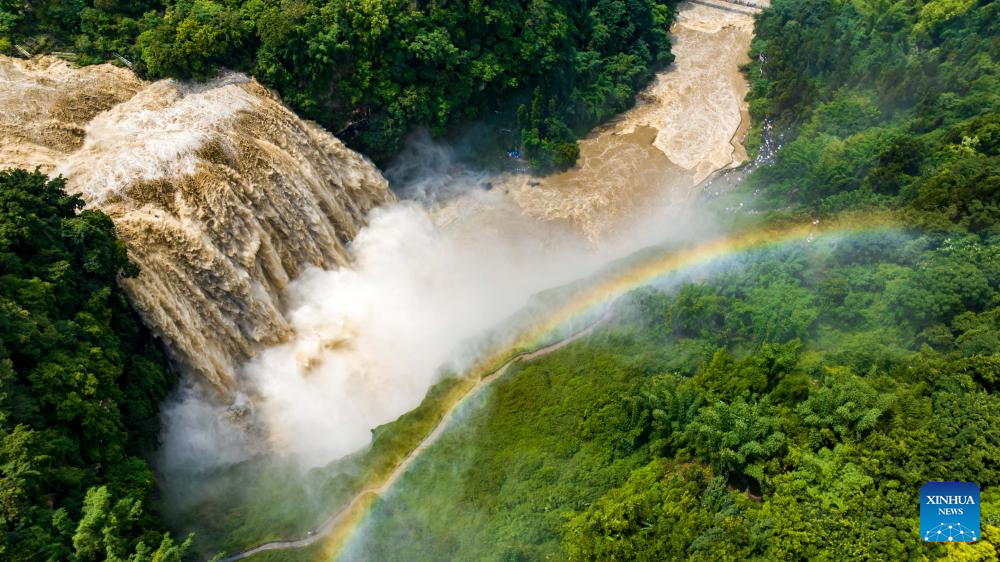 An aerial drone photo taken on June 20, 2024 shows a view of the Huangguoshu Waterfall in Anshun, southwest China's Guizhou Province. (Photo by Chen Xi/Xinhua)