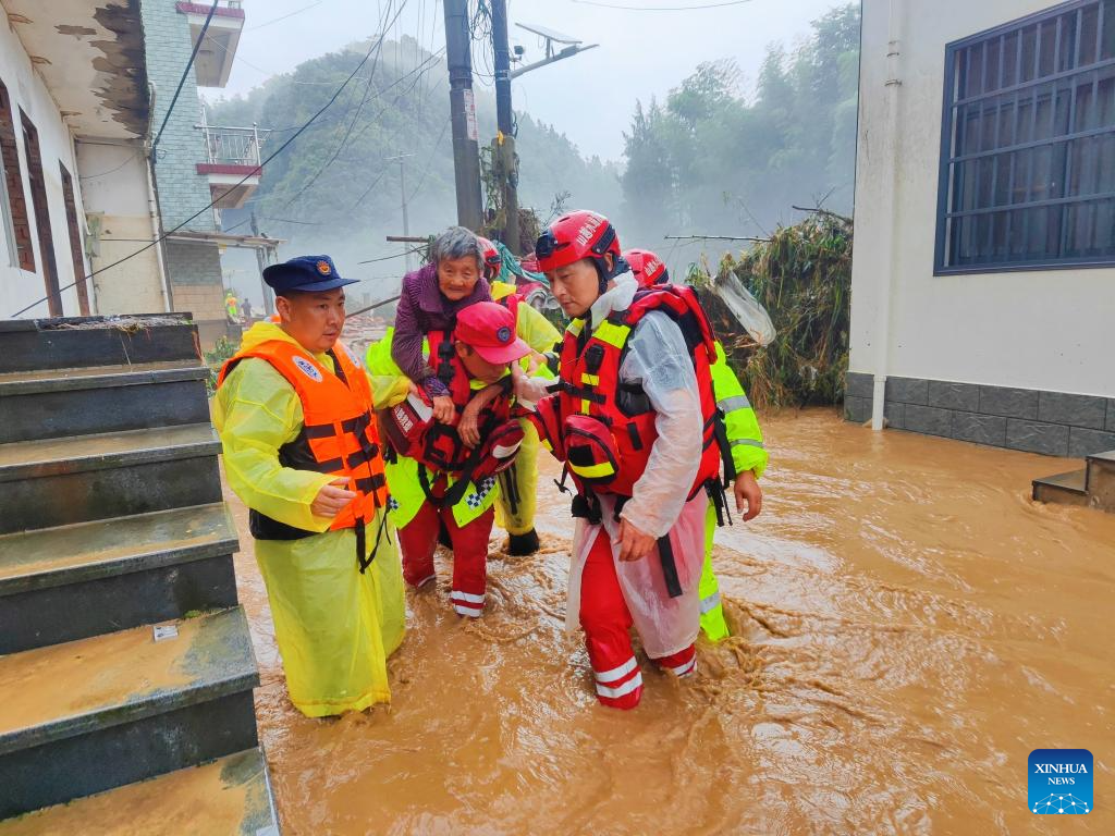 Rescuers transfer a flood-affected resident in Shexian County of Huangshan City, east China's Anhui Province, June 20, 2024. In Huangshan City of east China's Anhui Province, due to intense downpours, some 2,110 residents had been relocated as of 9 a.m. Thursday, according to the local flood control and drought relief headquarters. (Photo by Cheng Hongmei/Xinhua)