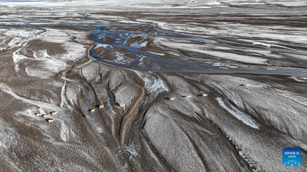 An aerial drone photo taken on June 15, 2024 shows a view of the Tianshui River in the Qiangtang National Nature Reserve in southwest China's Xizang Autonomous Region. Tianshui River is an important migratory passage for pregnant Tibetan antelopes in the Qiangtang National Nature Reserve. (Xinhua/Jigme Dorje)
