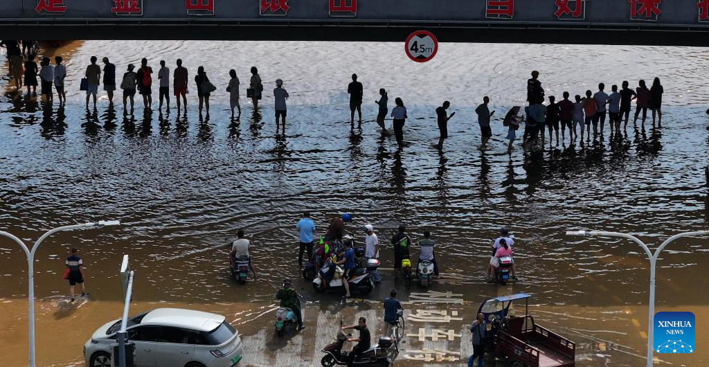 An aerial drone photo taken on June 20, 2024 show residents waiting for evacuation at a flooded road in Guilin, south China's Guangxi Zhuang Autonomous Region. Heavy rainfall has pelted many areas in southern China since June 9, prompting local authorities to beef up flood control and rescue measures to reduce disaster damage. (Xinhua/Huang Xiaobang)