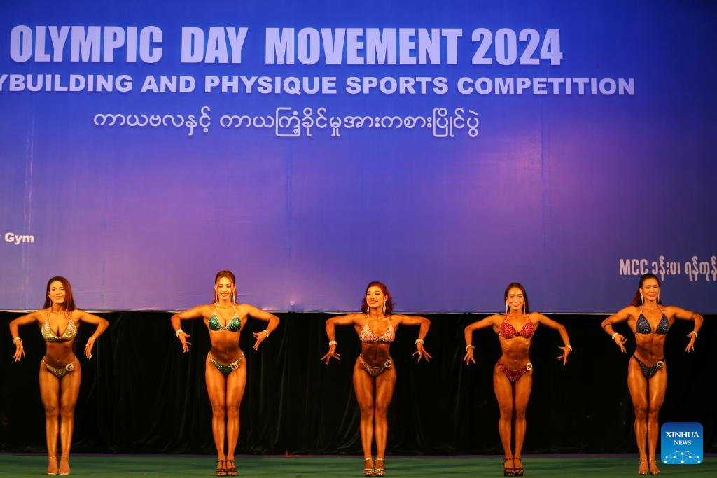 Contestants compete during the Bodybuilding and Physique Sports Competition to mark the Olympic Day 2024 in Yangon, Myanmar, June 22, 2024. (Photo by Myo Kyaw Soe/Xinhua)