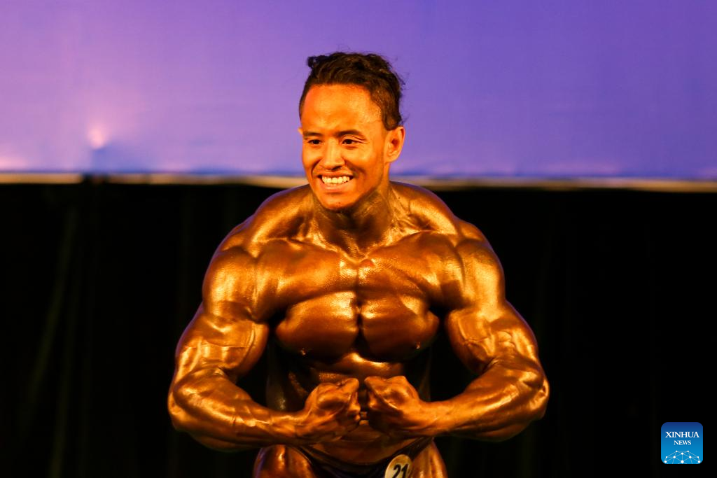 A contestant competes during the Bodybuilding and Physique Sports Competition to mark the Olympic Day 2024 in Yangon, Myanmar, June 22, 2024. (Photo by Myo Kyaw Soe/Xinhua)
