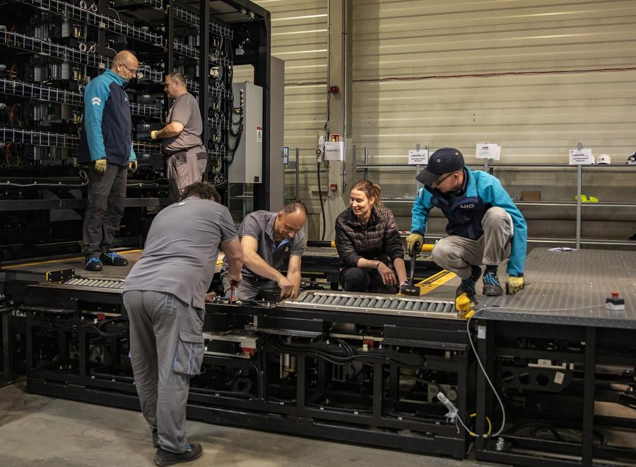 Staff members work at the NIO Power Europe Plant in Biatorbagy, Hungary, March 18, 2024. (Xinhua/Zhang Fan)