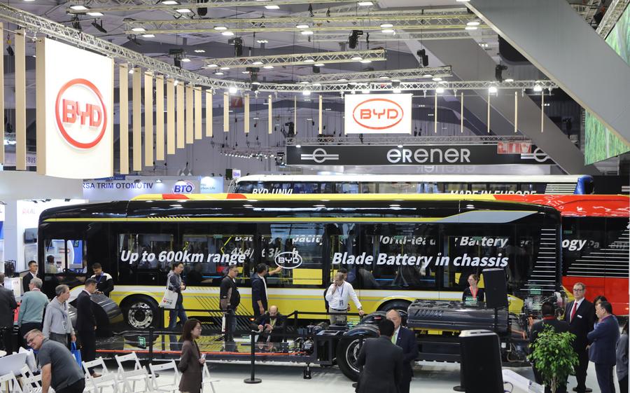 People visit the booth of Chinese automaker BYD during the Busworld Europe in Brussels, Belgium, Oct. 7, 2023. (Xinhua/Pan Geping)