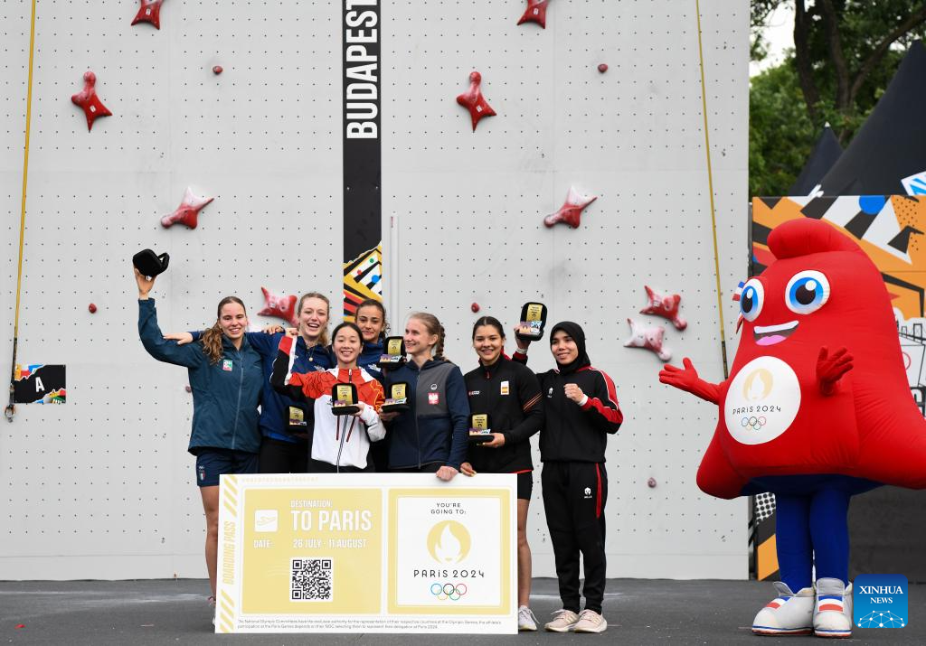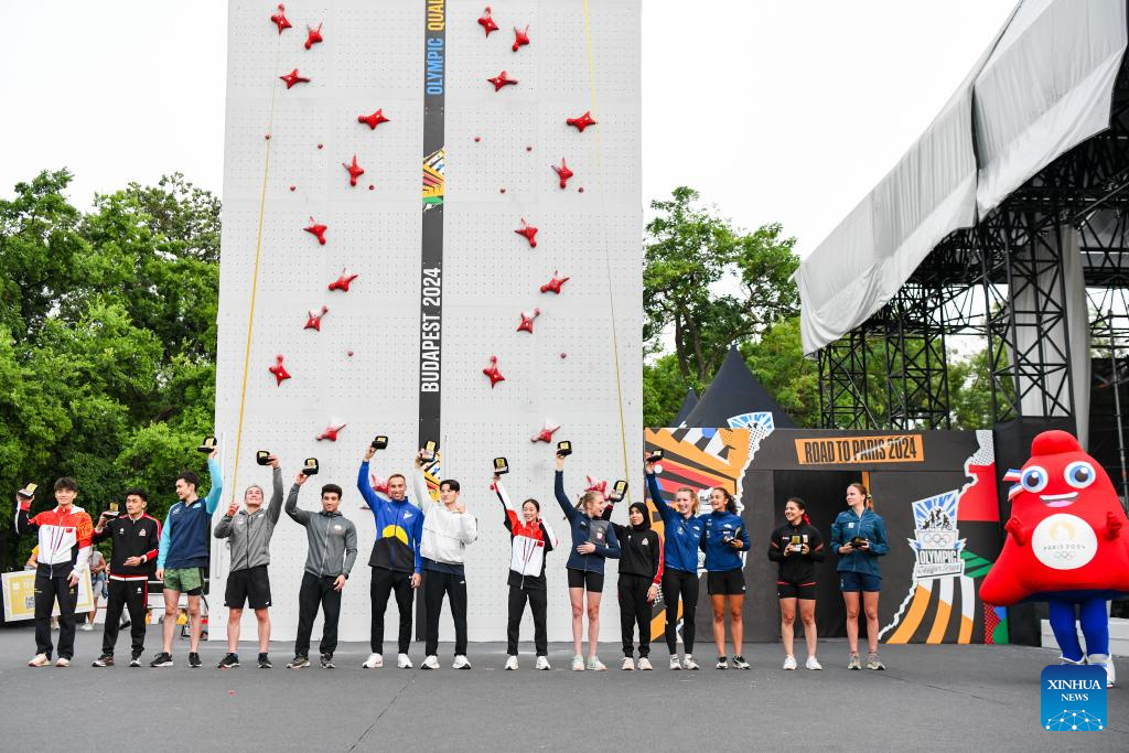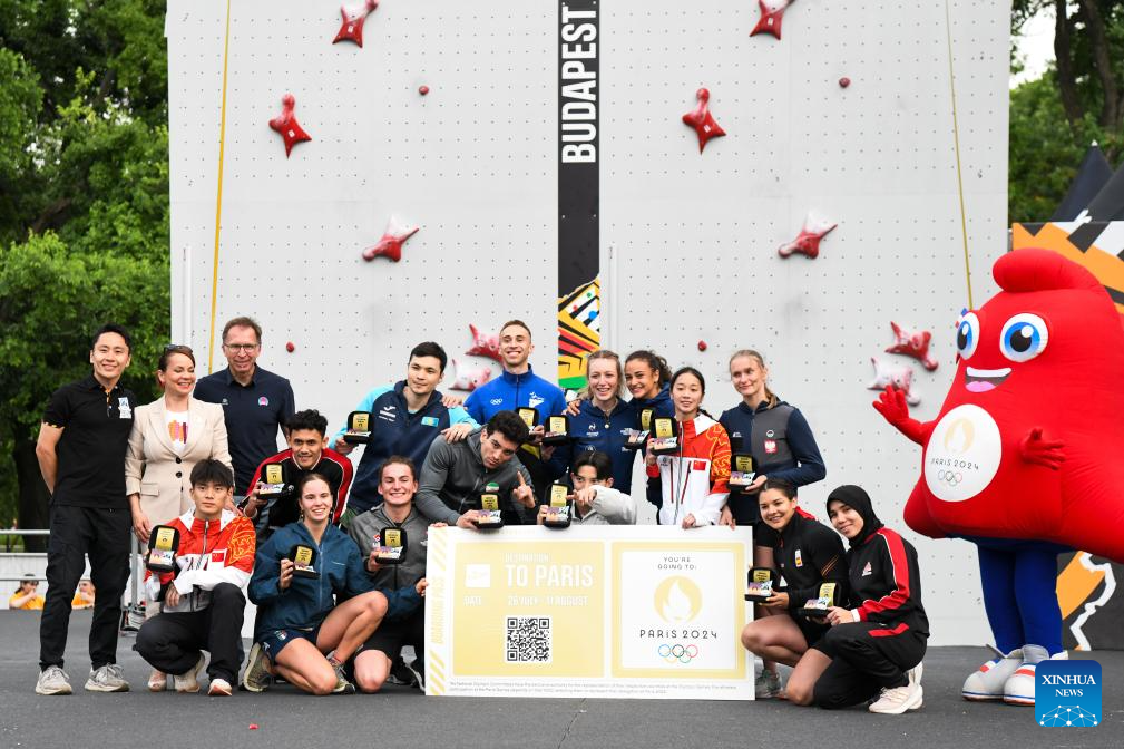 Speed climbing qualifiers of Paris 2024 pose for a group photo during the "Road to Paris" event at the Olympic Qualifier Series Budapest in Budapest, Hungary, June 22, 2024. (Xinhua/Lian Yi)