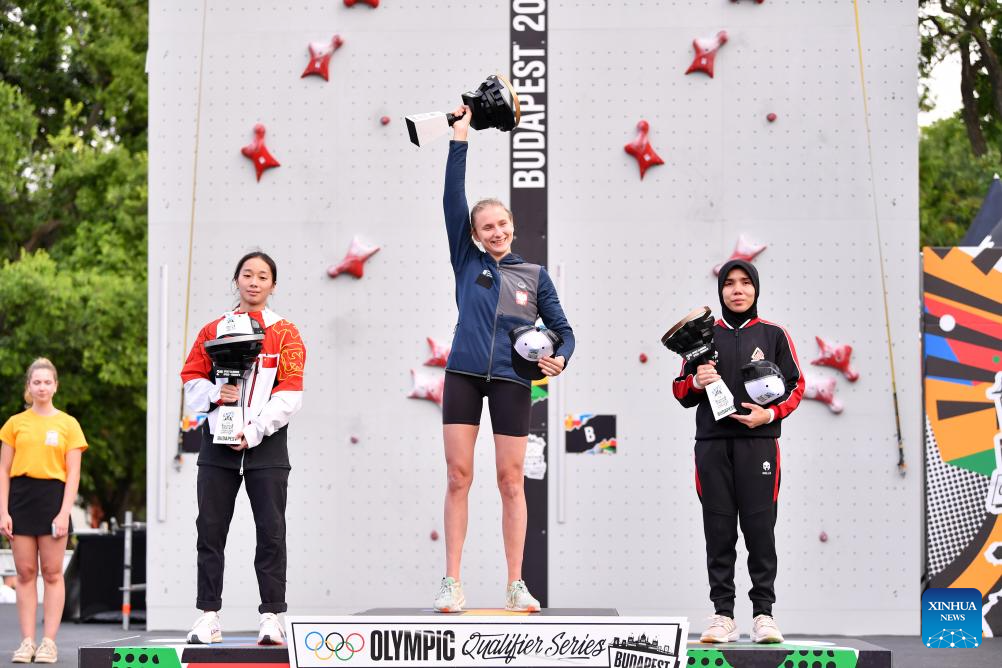 Winner Natalia Kalucka (C) of Poland, second-placed Zhou Yafei (L) of China and third-placed Rajiah Sallsabillah of Indonesia pose during the awarding ceremony of the women's speed of sport climbing at the Olympic Qualifier Series Budapest in Budapest, Hungary, June 22, 2024. (Xinhua/Lian Yi)