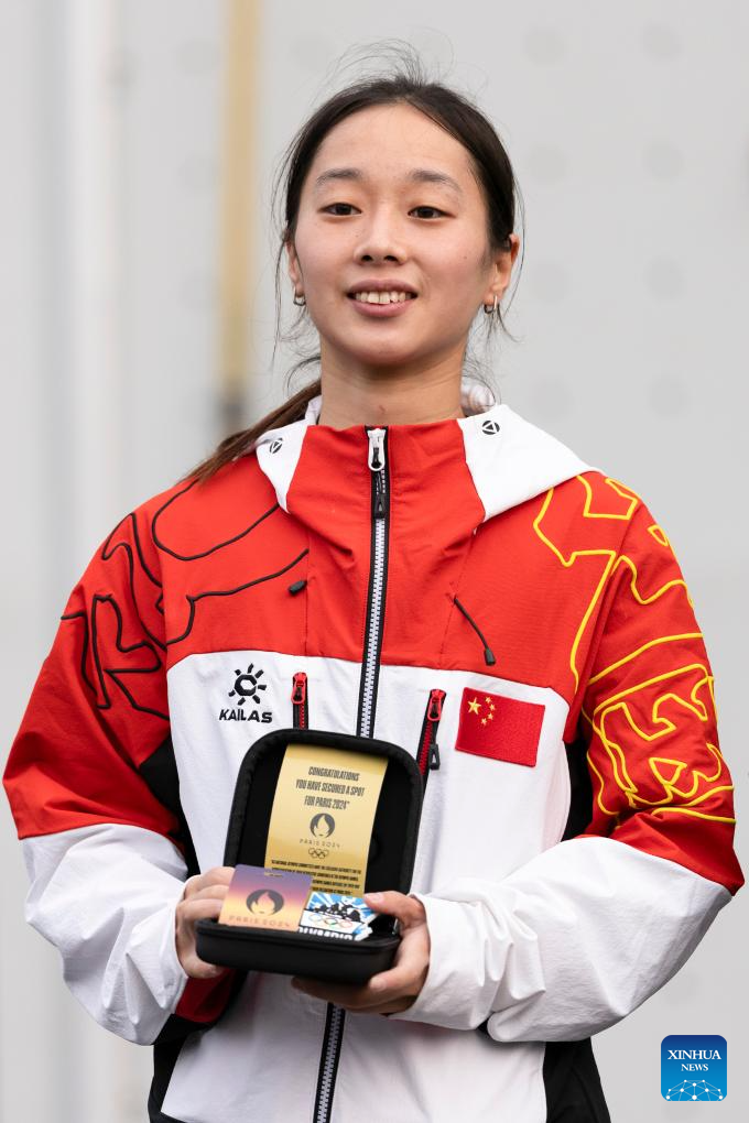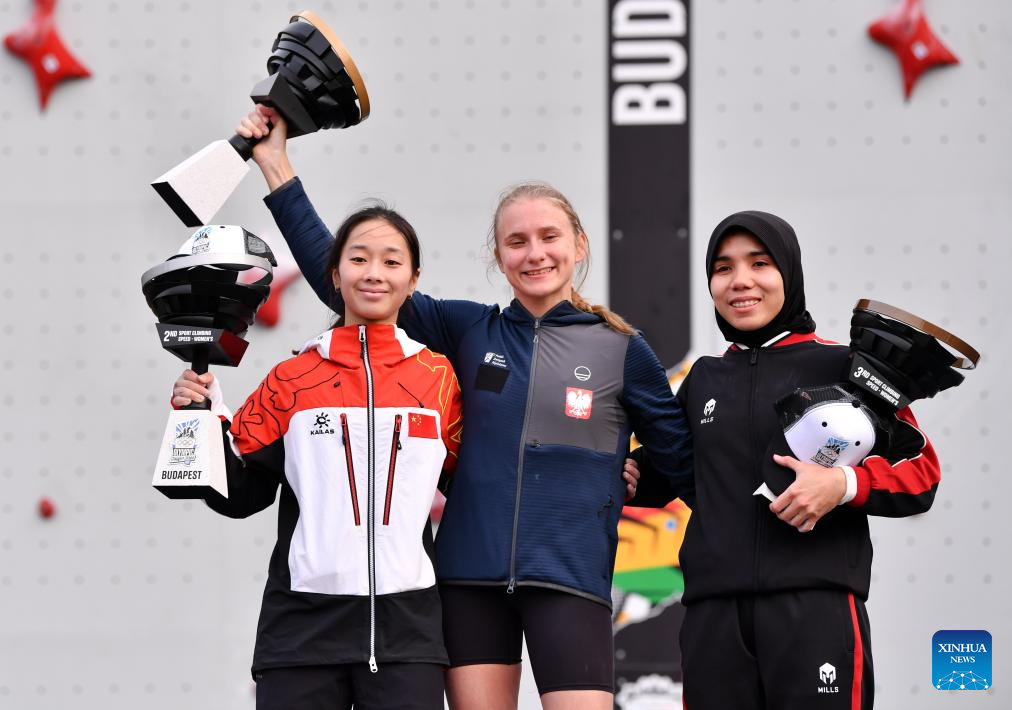Second-placed Zhou Yafei of China poses during the awarding ceremony of the women's speed of sport climbing at the Olympic Qualifier Series Budapest in Budapest, Hungary, June 22, 2024. (Photo by Attila Volgyi/Xinhua)