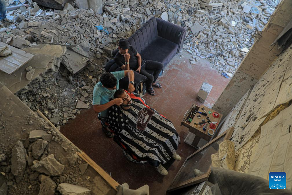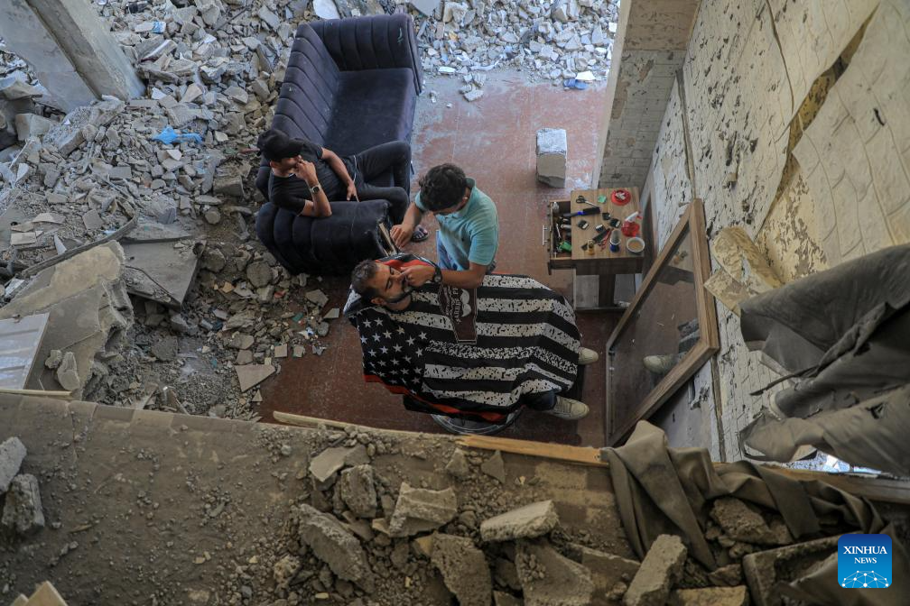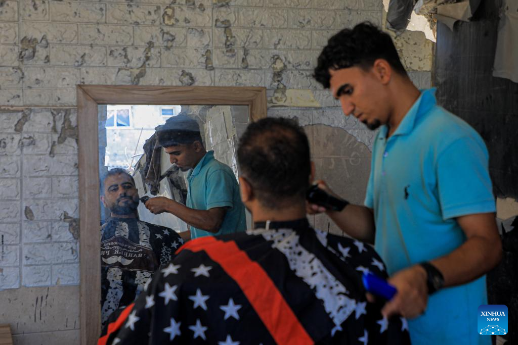 Abdullah Ramadan, 26, a Palestinian barber, works for a client at his shop, which was destroyed in Israeli airstrikes in the Al-Bureij refugee camp in central Gaza, June 23, 2024. (Photo by Rizek Abdeljawad/Xinhua)