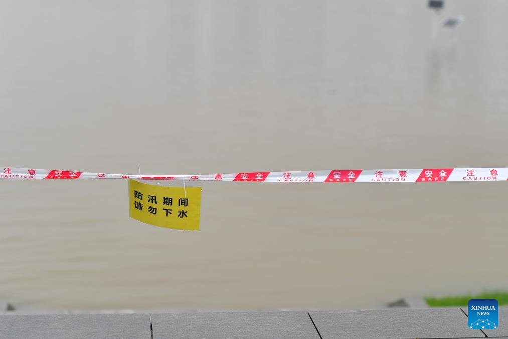 This photo taken on June 26, 2024 shows a safety warning on an embankment in the Changsha section of the Xiangjiang River in Changsha, central China's Hunan Province. Due to continuous heavy rainfall, water level recorded at the Changsha hydrological observation station reached to 36.75 meters at 1:32 p.m. on Wednesday, 0.75 meters above the alert line. (Xinhua/Chen Zeguo)