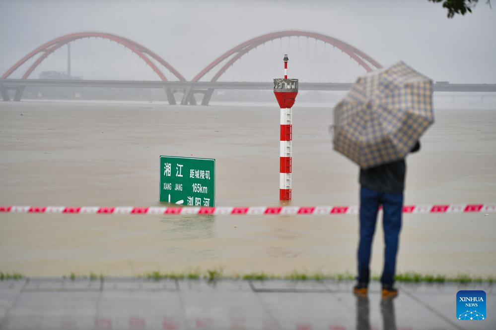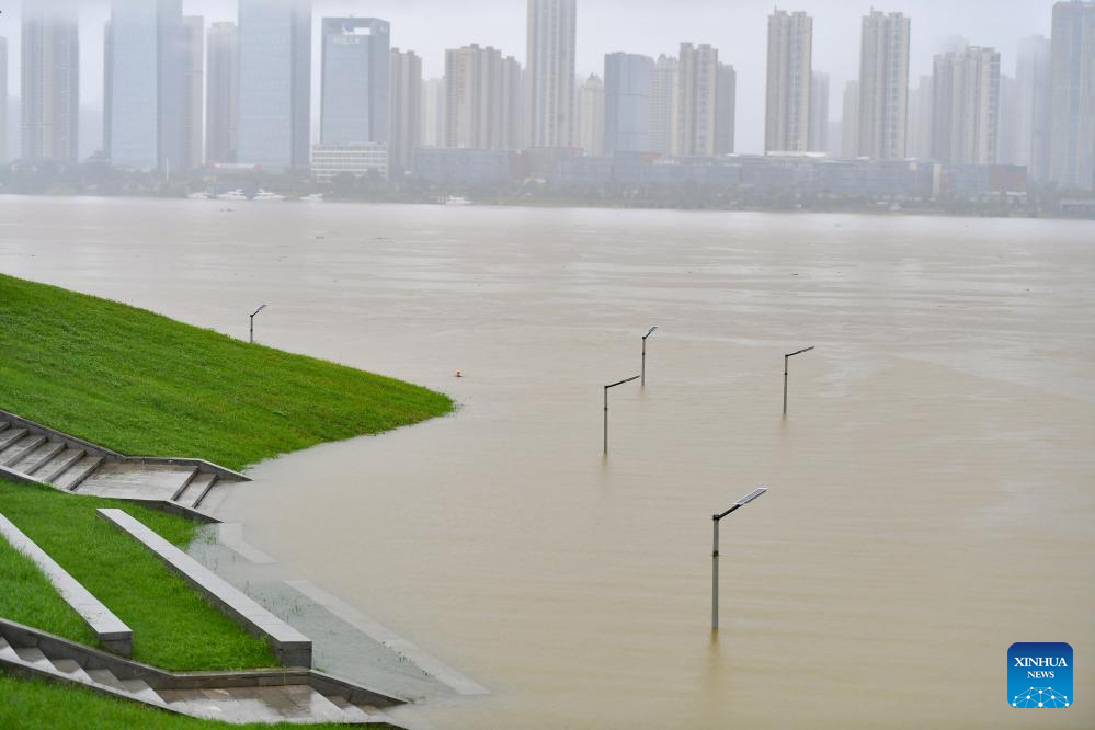 This photo taken on June 26, 2024 shows a flooded riverside sightseeing area in Changsha, central China's Hunan Province. Due to continuous heavy rainfall, water level recorded at the Changsha hydrological observation station reached to 36.75 meters at 1:32 p.m. on Wednesday, 0.75 meters above the alert line. (Xinhua/Chen Zeguo)