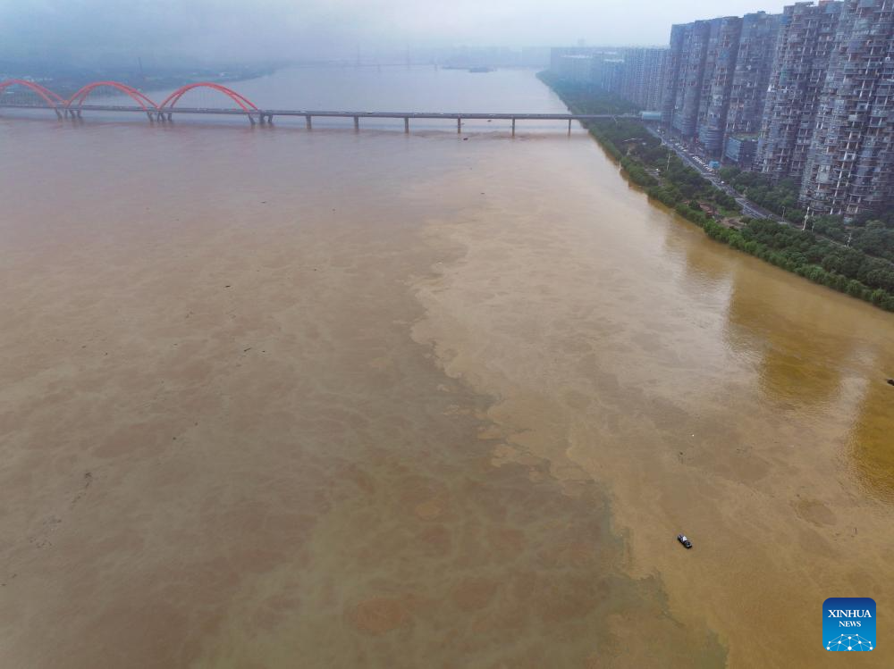 An aerial drone photo taken on June 26, 2024 shows the confluence of the Xiangjiang and Liuyang rivers in Changsha, central China's Hunan Province. Due to continuous heavy rainfall, water level recorded at the Changsha hydrological observation station reached to 36.75 meters at 1:32 p.m. on Wednesday, 0.75 meters above the alert line. (Xinhua/Chen Zeguo)