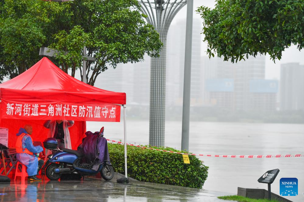 Staff members stay alert for flood warnings near the Xiangjiang River in Changsha, central China's Hunan Province, June 26, 2024. Due to continuous heavy rainfall, water level recorded at the Changsha hydrological observation station reached to 36.75 meters at 1:32 p.m. on Wednesday, 0.75 meters above the alert line. (Xinhua/Chen Zeguo)