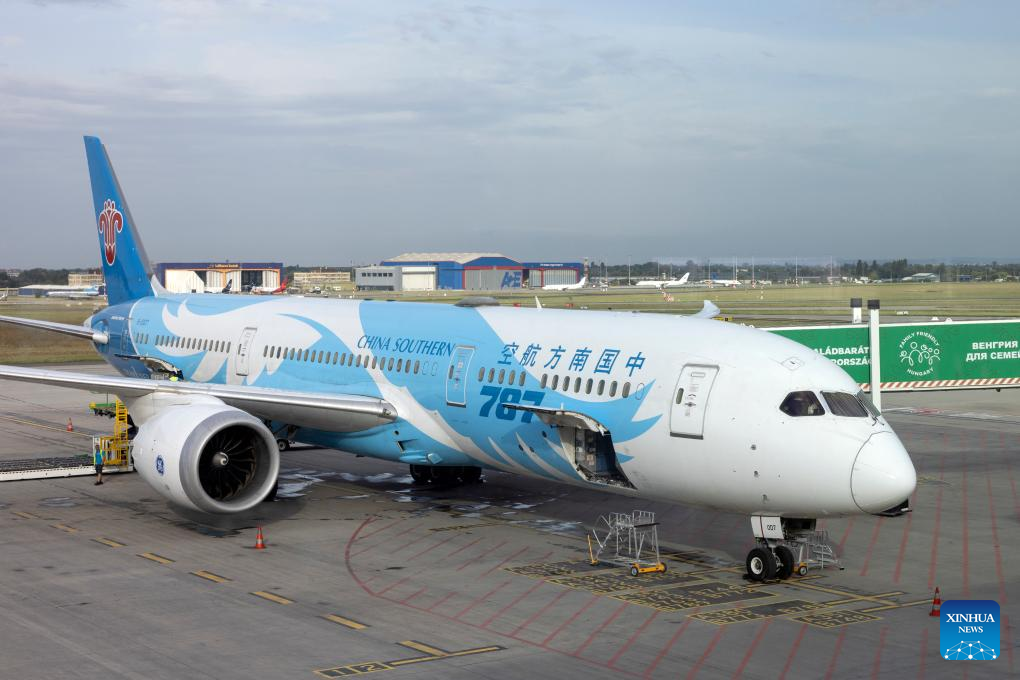 A passenger aircraft of China Southern Airlines arrives at the Budapest Ferenc Liszt International Airport in Budapest, Hungary on June 27, 2024. A new direct air route linking Guangzhou, the capital of south China's Guangdong Province, with Budapest in Hungary, was launched on Thursday. (Photo by Attila Volgyi/Xinhua)
