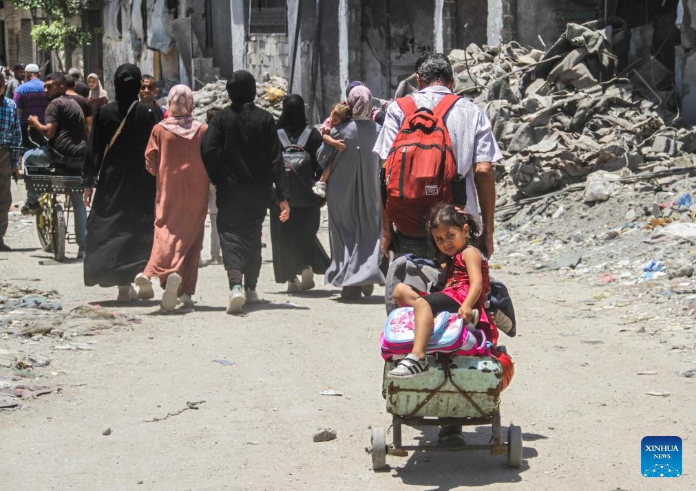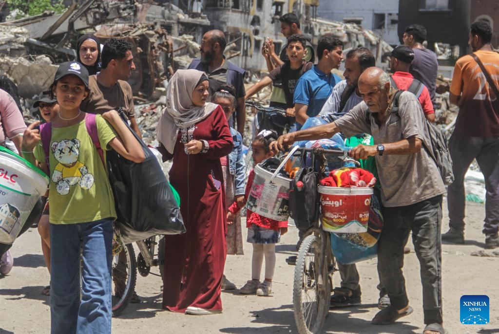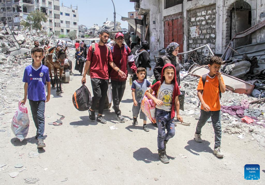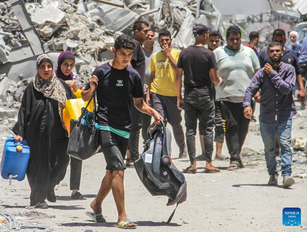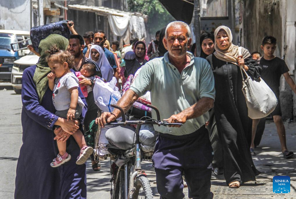 People leave their home in the neighborhood of Shuja'iya in the east of Gaza City, on June 27, 2024. The Israeli army on Thursday ordered residents of neighborhoods in eastern Gaza City to evacuate immediately amid the incursion of its military forces into the areas. (Photo by Mahmoud Zaki/Xinhua)