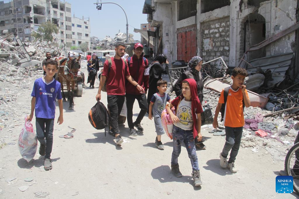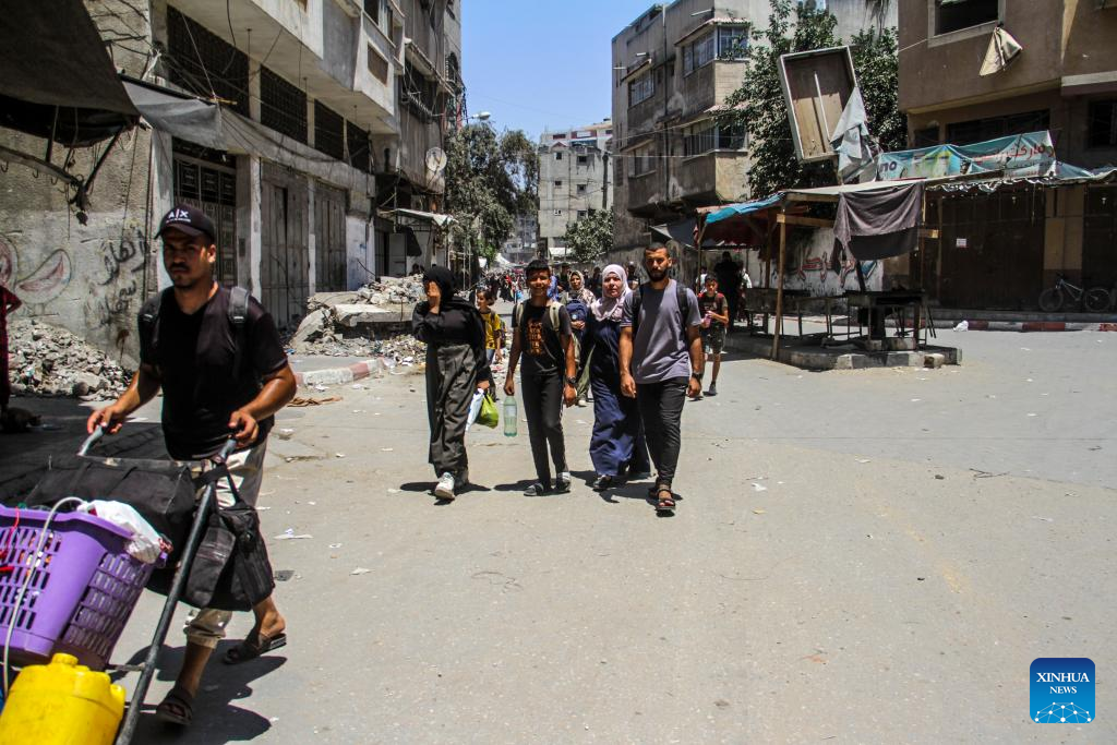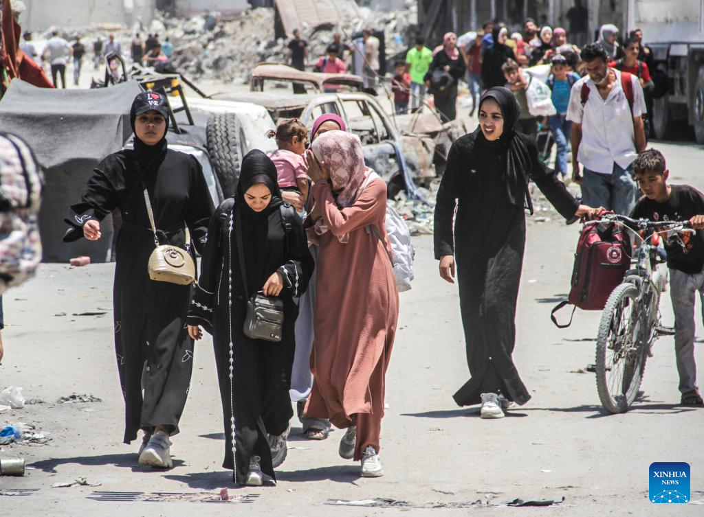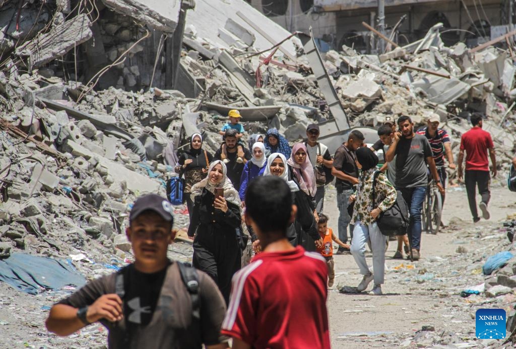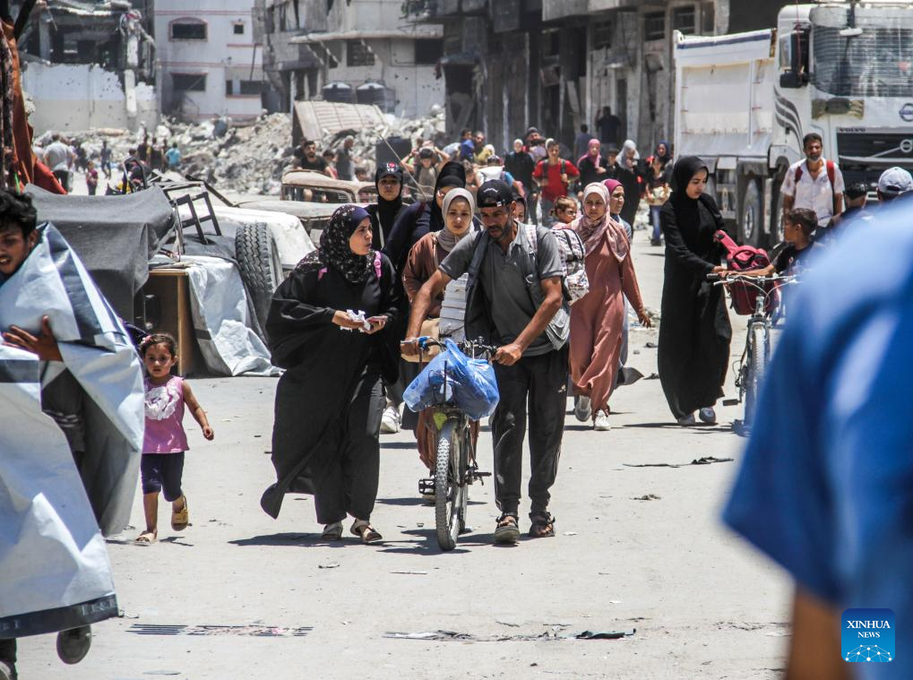 People leave their home in the neighborhood of Shuja'iya in the east of Gaza City, on June 27, 2024. The Israeli army on Thursday ordered residents of neighborhoods in eastern Gaza City to evacuate immediately amid the incursion of its military forces into the areas. (Photo by Mahmoud Zaki/Xinhua)