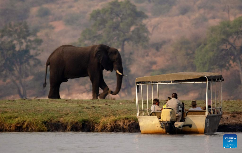 Tourists watch an elephant in Chobe river of Kasane village, Botswana, Sept. 23, 2022. Elephants are migrating to unpredictable areas in search of food and water as a result of climate change, experts have told an elephant conservation meeting in Gaborone, Botswana's capital. (Photo by Metlha Ngubevana/Xinhua)