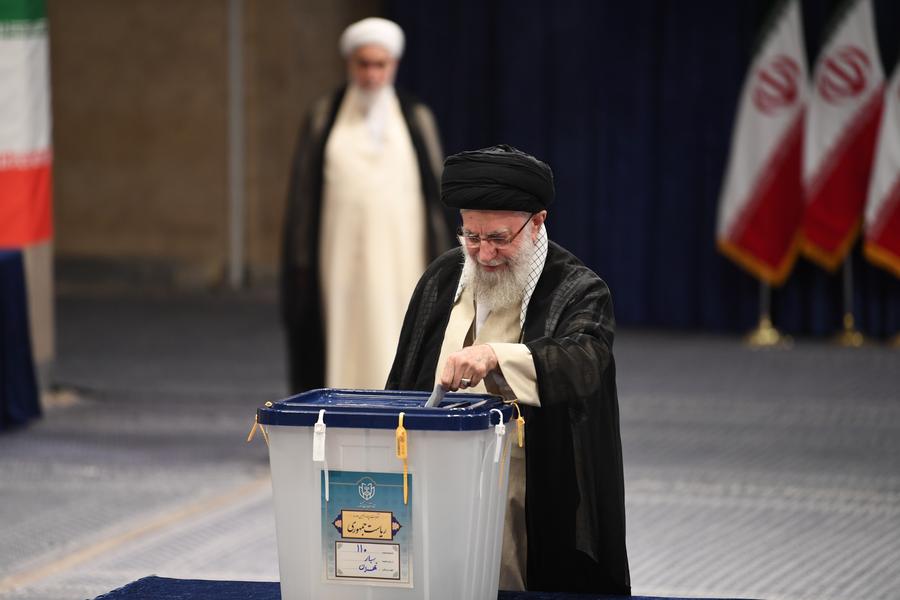 Iran's Supreme Leader Ali Khamenei casts his ballot for Iran's 14th presidential election at a polling station in Tehran, Iran, June 28, 2024. (Xinhua/Shadati)