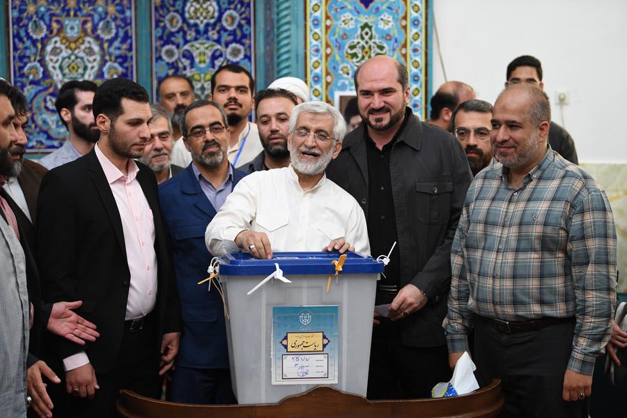 A voter casts her ballot for Iran's 14th presidential election at a polling station in Tehran, Iran, June 28, 2024. (Xinhua/Shadati)Saeed Jalili (C, front), the former top negotiator for nuclear talks, casts his ballot for Iran's 14th presidential election at a polling station in Tehran, Iran, June 28, 2024. (Xinhua/Shadati)A voter casts his ballot for Iran's 14th presidential election at a polling station in Tehran, Iran, June 28, 2024. (Xinhua/Shadati)A voter casts his ballot for Iran's 14th presidential election at a polling station in Tehran, Iran, June 28, 2024. (Xinhua/Shadati)A voter casts his ballot for Iran's 14th presidential election at a polling station in Tehran, Iran, June 28, 2024. (Xinhua/Shadati)■