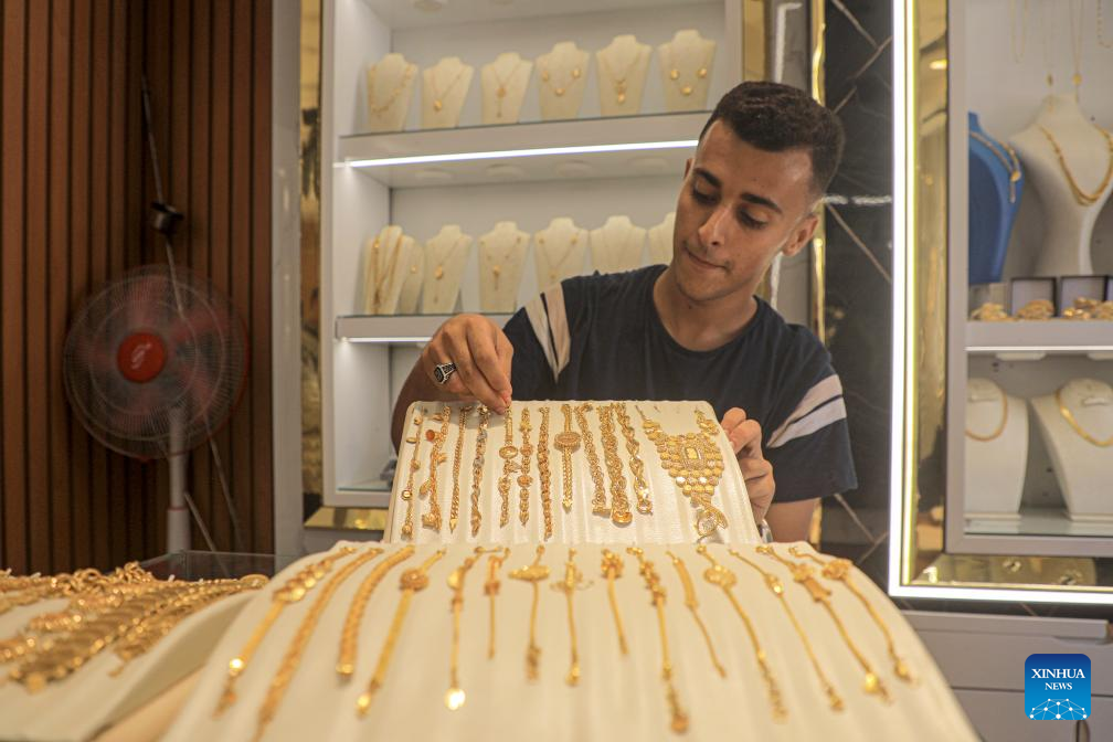 A merchant displays gold jewelry at a gold shop in the southern Gaza Strip city of Khan Younis, on June 26, 2024. (Photo by Rizek Abdeljawad/Xinhua)