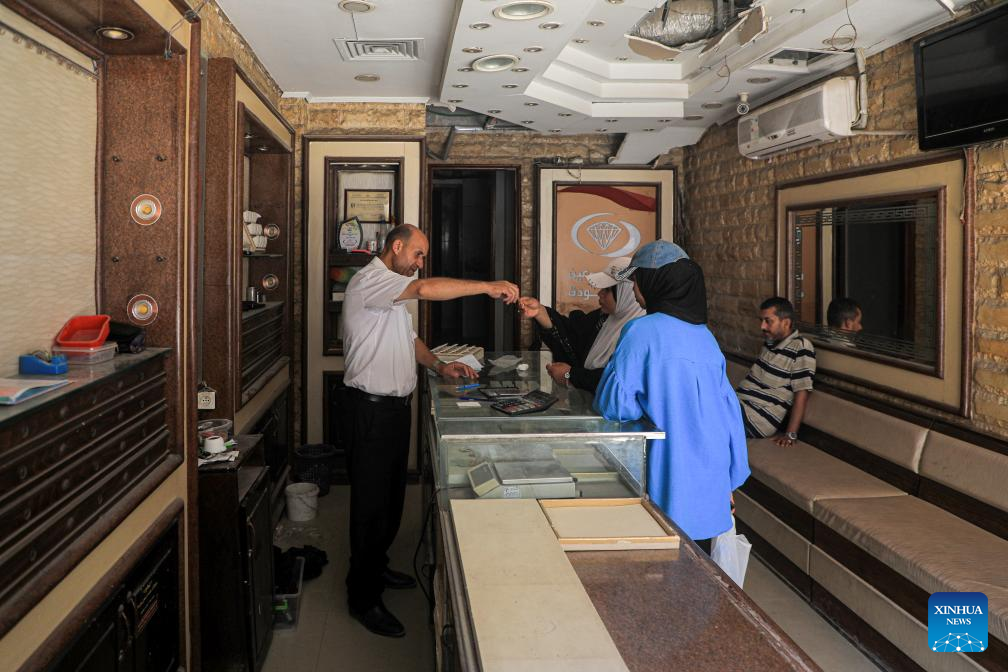 People are seen at a gold shop in the southern Gaza Strip city of Khan Younis, on June 26, 2024. (Photo by Rizek Abdeljawad/Xinhua)