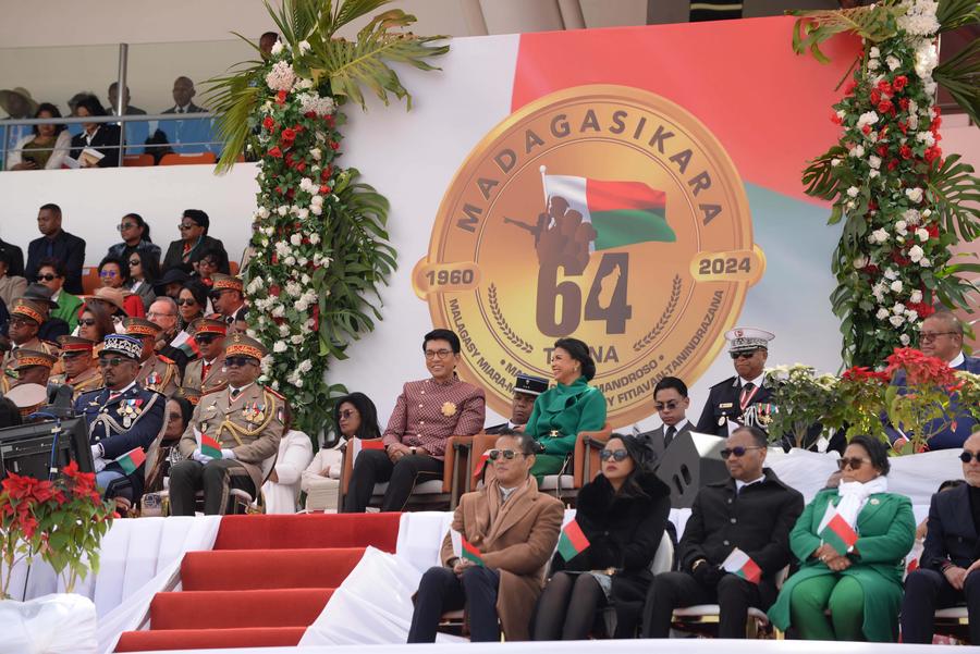 A military parade is held during a celebration marking the 64th anniversary of Madagascar's independence in Antananarivo, the capital of Madagascar, June 26, 2024. (Photo by Sitraka Rajaonarison/Xinhua)A military parade is held during a celebration marking the 64th anniversary of Madagascar's independence in Antananarivo, the capital of Madagascar, June 26, 2024. (Photo by Sitraka Rajaonarison/Xinhua)Malagasy President Andry Rajoelina (L, center) and his wife attend a celebration marking the 64th anniversary of Madagascar's independence in Antananarivo, the capital of Madagascar, June 26, 2024. (Photo by Sitraka Rajaonarison/Xinhua)A military parade is held during a celebration marking the 64th anniversary of Madagascar's independence in Antananarivo, the capital of Madagascar, June 26, 2024. (Photo by Sitraka Rajaonarison/Xinhua)■