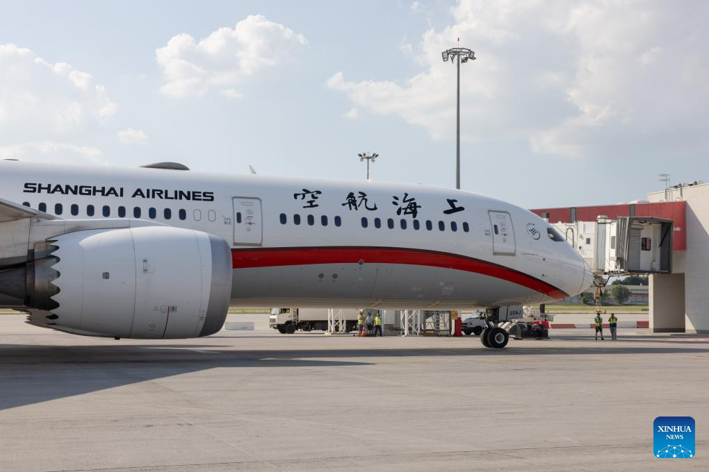 An aircraft from Xi'an, capital of northwest China's Shaanxi Province, arrives at Budapest Ferenc Liszt International Airport in Budapest, Hungary, June 29, 2024. Direct flights between Xi'an, capital of northwest China's Shaanxi Province, and Budapest resumed on Saturday.