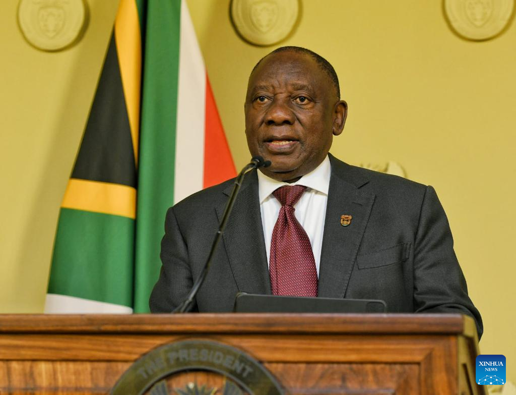 South African President Cyril Ramaphosa speaks during a televised national address in Pretoria, South Africa, June 30, 2024. Ramaphosa announced the lineup of his new national executive cabinet Sunday, comprising ministers from various political parties that form the Government of National Unity (GNU). (Government Communication and Information System/Handout via Xinhua)