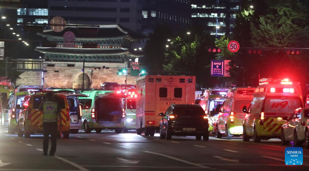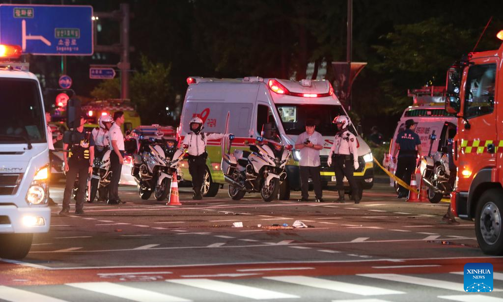 This photo taken on July 1, 2024 shows the site of a traffic accident in Seoul, South Korea. Six people had been confirmed dead and eight others injured in a traffic accident in South Korea, Yonhap news agency reported Monday. A major vehicle accident took place at about 9:30 p.m. local time (1230 GMT) near an intersection of the Seoul City Hall. (Xinhua/Yao Qilin)
