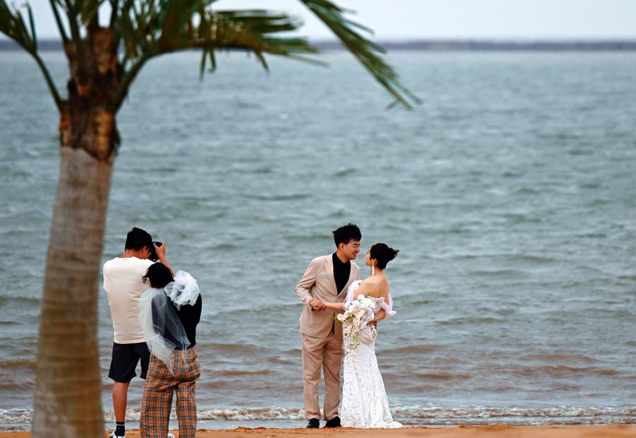 A couple poses for photos by the seaside in the Binhai New Area of north China's Tianjin, June 29, 2024. (Xinhua/Zhao Zishuo)