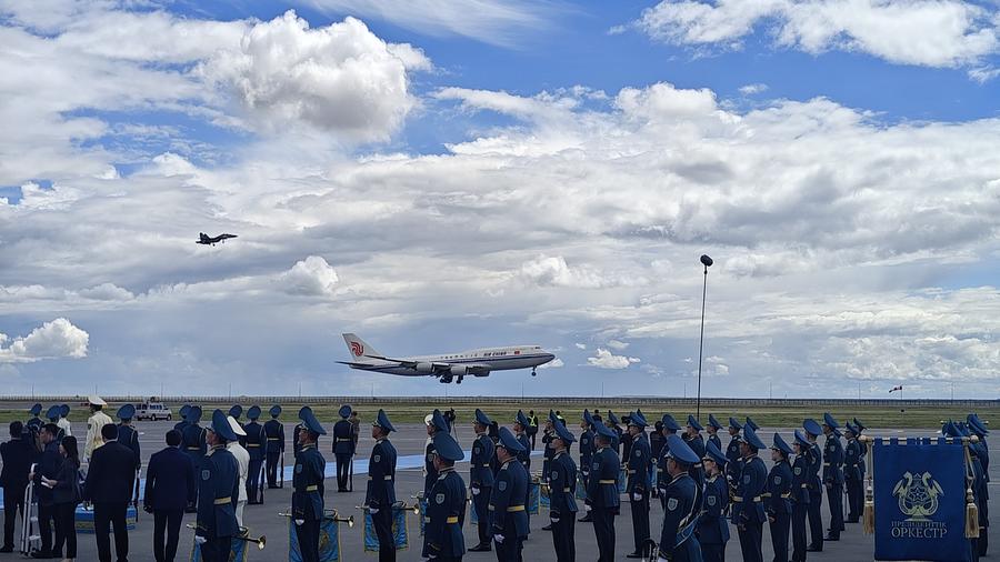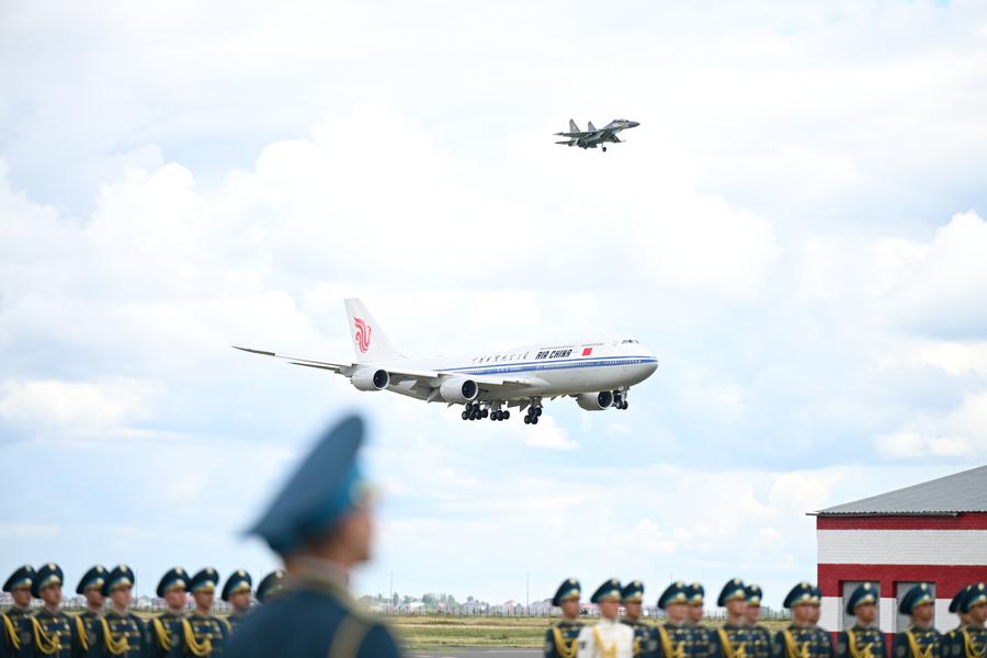 Chinese President Xi Jinping's plane is seen escorted by Kazakh fighter jets upon his arrival in Kazakhstan for a summit of the Shanghai Cooperation Organization and a state visit.